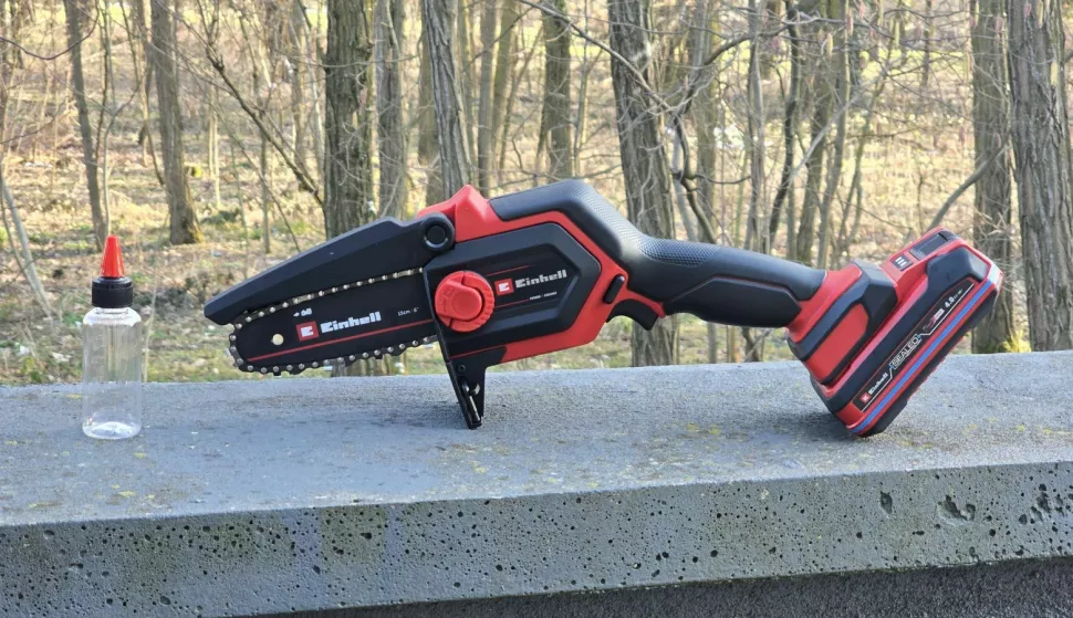 Prvo što nas je oduševilo kod Einhell GE-PS 18/15 Li BL-Solo jest njegova kompaktnost. Zanimljivo je vidjeti koliko kompaktna lančana pila može biti, a ovom iz Einhella sigurno ćete ostati, kao i mi, ugodno iznenađeni. Pozitivan dojam samo se nastavlja, jer, poslovično za Einhell, ponovno svjedočimo vrhunski kvalitetno izrađenom alatu koji ulijeva povjerenje u svoju dugovječnost. Kako i ova kompaktna pila dolazi iz poznate Power X-Change serije aku-alata, znači da je kompatibilna sa svim baterijama i punjačima iz Einhell ekosustava. Ta fleksibilnost omogućuje korisnicima koji već posjeduju Einhell uređaje znatnu uštedu pri kupnji, a za svoj rad Einhell GE-PS 18/15 Li BL-Solo treba jednu bateriju. U paketu s pilom stiže i bočica za ulje kojim ćemo povremeno nauljiti lanac. Pila ima PurePOWER motor bez četkica, koji ne samo što pruža veću snagu i duže vrijeme rada u usporedbi s klasičnim motorima s četkicama nego i dolazi s 10-godišnjim jamstvom na motor nakon online-registracije. S duljinom mača od 15,8 cm i promjerom reza od 12,5 cm, ova pila je moćni saveznik svakog vrta. Kako smo već u uvodu spomenuli, unatoč respektabilnim performansama s obzirom na veličinu, ona je lagana, kompaktna i jednostavna za rukovanje te idealna za brzo i precizno rezanje grana.