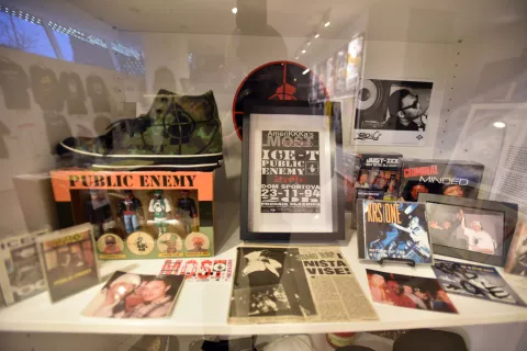 Tu je i štošta iz onog, kako kaže, ranog Zagreba, iz '86. i '87. godine pa sve do '92. Tu u su prvi grafiti zagrebački snimljeni prije nego su za Univerzijade prefarbani, tu su stare kazete, stare osobne iskaznice, prvi hip-hop press release što ga je 1989. sročila grupa The Silent Bomb za svoj demo. A evo i fotografije s jednog koncerta u SKUC-u i na njoj mladi Phillie kojem je ravno 14 godina! U toj vitrini njegova je posveta Zagrebu 1980-ih uz nekoliko vrijednih detalja iz Rijeke. Vitrina do posvećena je onom zbog kojeg se Zagrebu, a onda i Hrvatskoj, hip-hop i dogodio.