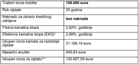 **Ukupan iznos za otplatu uključuje iznos glavnice kredita, iznos interkalarne kamate za razdoblje od mjesec dana te kamate obračunate do dospijeća, a koju bi korisnik kredita plaćao do konačne otplate kredita, godišnju premiju za policu osiguranja imovine u iznosu od 38,00 eura, mjesečnu naknadu za vođenje računa na koji se isplaćuju redovna mjesečna primanja u iznosu od 1,61 euro te trošak procjene nekretnine u iznosu od 275 eura.