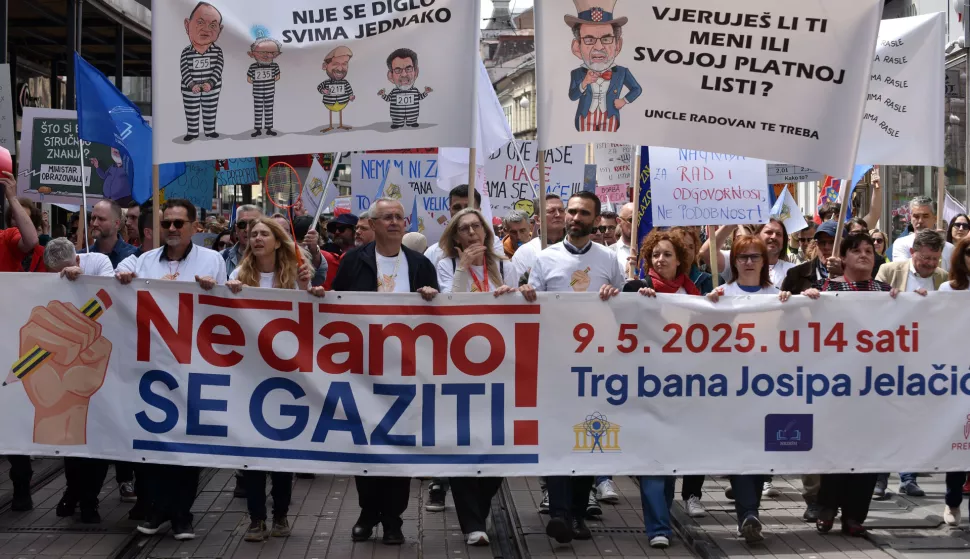 Ne damo se gaziti! Ne damo se gaziti! - skandiralo je oko pet tisuća učitelja, nastavnika, pomoćnika u nastavi, profesora, tehničkog i pomoćnog osoblja u školama, koliko ih se jučer u organizaciji triju obrazovnih sindikata okupilo na Trgu bana Jelačića tražeći korekciju koeficijenata i drukčiji odnos države prema obrazovanju i znanosti. Izviždali su ministra znanosti i obrazovanja Radovana Fuchsa, tražili njegovu smjenu, a brojni su transparenti u rukama prosvjednika nosili ministrovu i premijerovu sliku. "Gluplja nacija, lakša manipulacija", "Što si bez stručnog znanja? Ministar obrazovanja!", "Dok Fuchs spava, nama se krše prava", "Ministri, vlado, kad će bula? Radim ko mula za koeficijent - nula", poručili su brojnim transparentima, gdje su se mahom tražili veći koeficijent i bolji tretman sustava obrazovanja. Sindikalni su vođe na prosvjedu najavili tužbe protiv ministara Fuchsa i Piletića, prijavu protiv Hrvatske Međunarodnoj organizaciji rada zbog miješanja Vlade u djelovanje sindikata, a jučer je najavljen i novi štrajk u obrazovanju i znanosti, i to u lipnju, na samom kraju školske godine.