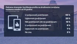 8 posto u potpunosti ne podržava zabranu društvenih mreža mlađima od 16, dok 7 posto uglavnom ne podržava, a 3 posto ne zna.