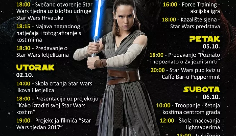Star Wars tjedan treći se put održava u Osijeku, i to od 1. do 6. listopada. Manifestaciju organiziraju Gradska i sveučilišna knjižnica Osijek (u čijim će se prostorijama i održavati) te Udruga Star Wars Hrvatska.