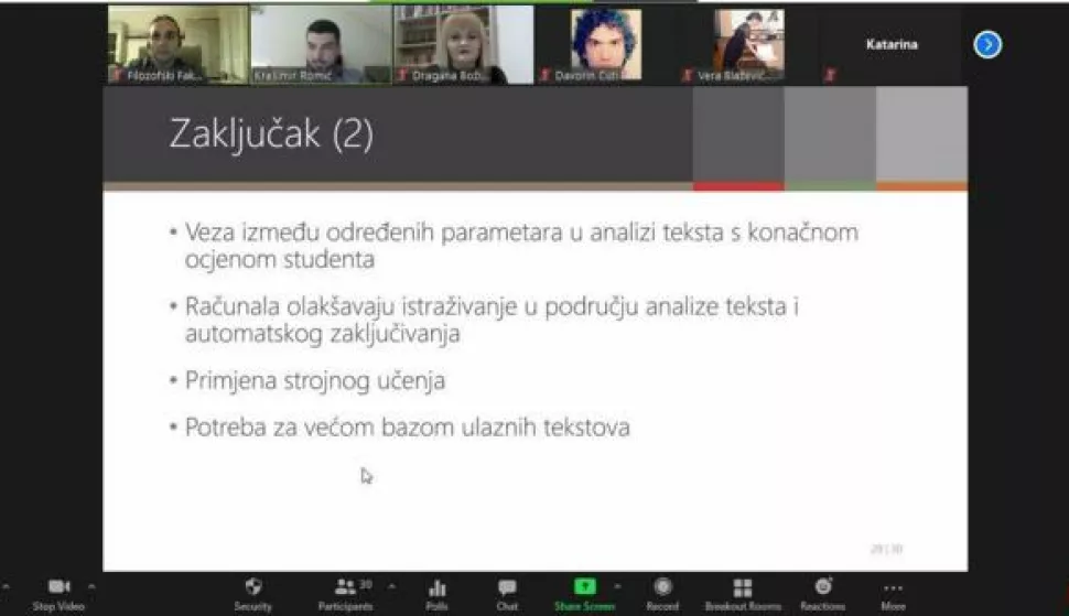 Može li računalni program zamijeniti ljudskog ocjenjivača u ocjenjivanju određene vrste eseja, pitanje je koje se nametnulo kao glavno u predavanju i raspravi u sklopu 9. ciklusa Otvorenog četvrtka. O predviđanju uspjeha na temelju načina izražavanja govorili su profesori s FERIT-a doc. dr. sc. Dragana Božić Lenard i dr. sc. Krešimir Romić. Zbog epidemioloških okolnosti predavanje je održano putem Zooma.