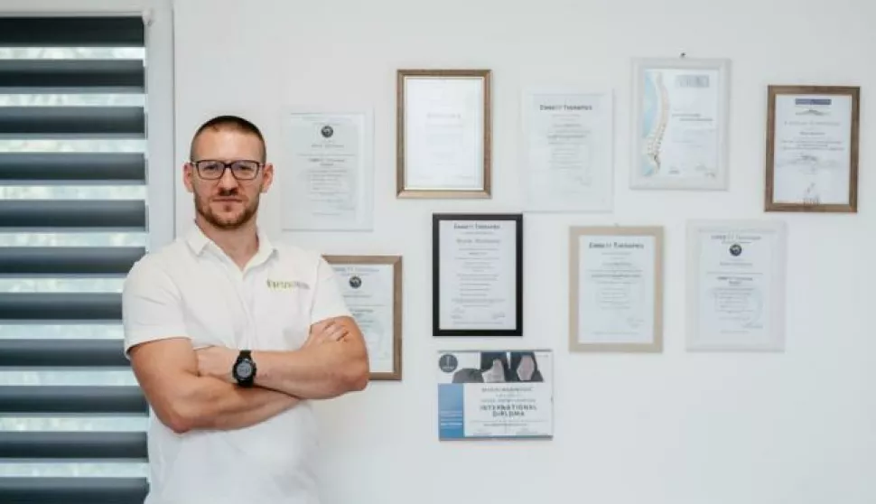 - Moj je uzor u poslu prijatelj i kolega koji ima veliku poliklinku u Zagrebu u kojoj radi i sa slavnim sportašima. Počeo je s mojih pozicija i razvijao je posao postupno, kako i ja to radim. Fakultet me oduševio i namjeravam završiti i diplomski studij, no kako sam posljednje dvije godine usporedno s poslom i na edukaciji iz ortopedske manualne terapije (kiropraktike), to sam morao odgoditi. Završio sam i mnoge druge edukacije, stekao sam certifikat za EMMETT terapeuta, ERGON IASTM terapeuta, Bowen terapeuta, za DNS rehabilitaciju... Prošao sam edukaciju londonske škole osteopatske manipulacije kralježnice OMT training UK, španjolsku školu fizioterapije kod lumbalgije, išijasa, hernije Instema fisioterapia, španjolske škole spinalne manipulacije kralježnice Instema fisioterapia, međunarodnu edukaciju iz kiropraktike talijanskog doktora osteopatije Giovannija Bonfantija, osteopatske artikulacijske tehnike londonskog profesora osteopatije Davida Lintonbona, specijaliziran sam za prevenciju sportskih ozljeda lokomotornog sustava te sportske masaže... Kolegica Ema Kolarić, mag. kineziologije, s kojom radim, također je na stalnim edukacijama, a uskoro nam stiže i treća članica tima. Svatko će od nas u Fizionovi raditi ono u čemu je najbolji, dakle moći ćemo pružiti kompletnu i kvalitetnu uslugu. Osobno, najviše sam se našao u kiropraktici, to mi je najveća ljubav - ne skida osmijeh s lica Marin dok govori o svom poslu, a pun zid diploma dokazuje koliko je vremena, truda i vlastitog novca uložio u sebe i svoju Fizionovu.