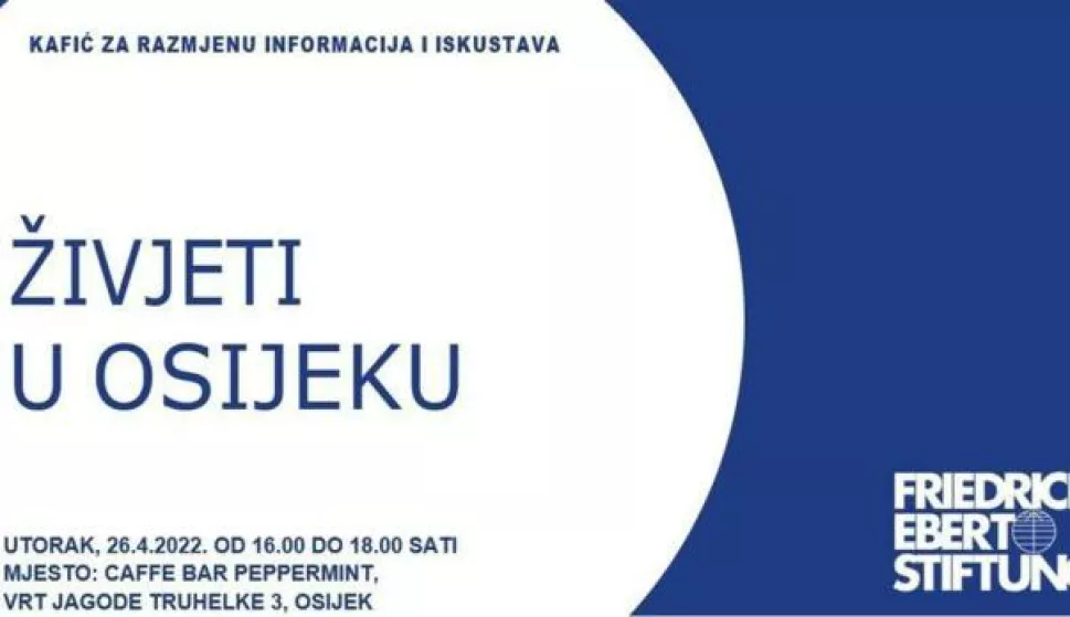 "Živjeti u Osijeku" druženje je koje će se u utorak (26. travnja) od 16 do 18 sati održati u kafiću Peppermint (Vrt J. Truhelke 3). Prilika je to da Osječanke i Osječani pokažu solidarnost i gostoprimstvo prema ljudima iz Ukrajine koji su nedavno stigli u naš grad. "Pridružite nam se na kavi, čaju ili piću po izboru i sudjelujte u čavrljanju u kojem želimo ljudima iz Ukrajine približiti grad Osijek, praktične stvari iz svakodnevice te povijest. Dođite i razgovarajte, družite se, recite im gdje se u gradu pije dobra kava, gdje je po vama najljepše šetati se, kome se obratiti u vezi s problemima u školi, na kojem mjestu se smije plivati u Dravi i drugo", poziva Lejla Šehić Relić iz DKolektiva. I.R.G.