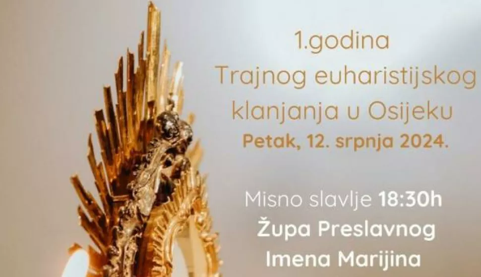 Prva godina trajnog euharistijskog klanjanja u Osijeku obilježit će se u petak, 12. srpnja, misnim slavljem u donjogradskoj župnoj crkvi Preslavnoga Imena Marijina u 18.30, koje će predvoditi đakovačko-osječki nadbiskup Đuro Hranić. Nakon mise bit će kratko klanjanje. Pozvani su na sudjelovanje svi trajni klanjatelji i zainteresirani vjernici, a oni koji se žele priključiti trajnom klanjanju u kapeli Gospe Snježne u Osijeku mogu se javiti na broj telefona 098 975 0221. A.M.