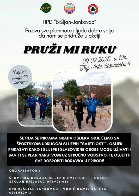 Hrvatsko planinarsko društvo "Bršljan-Jankovac" iz Osijeka poziva sve osječke planinare i ljude dobre volje da im se u nedjelju (9. veljače) pridruže na Trgu Ante Starčevića s početkom u 10 sati u akciji "Pruži mi ruku".