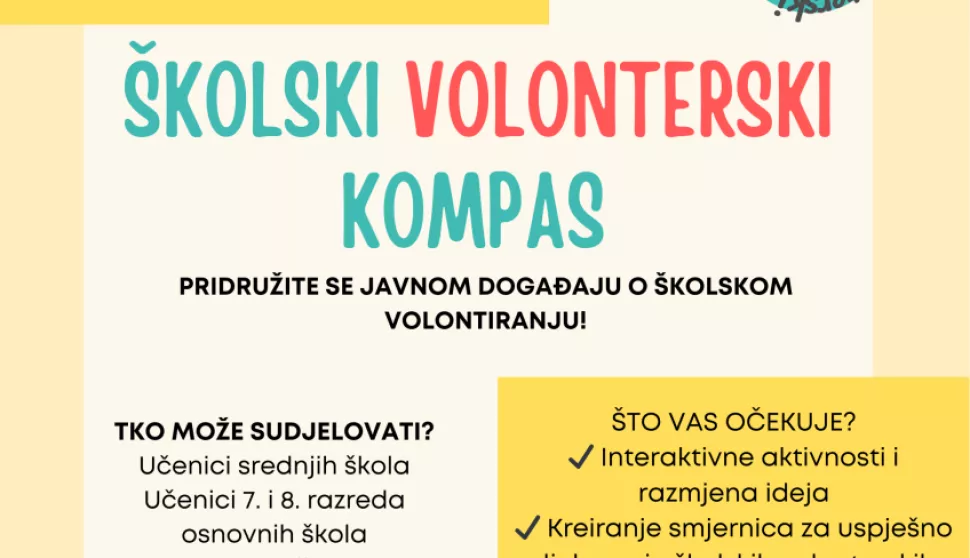 DKolektiv - organizacija za društveni razvoj poziva učenike (srednjoškolce i učenike 7. i 8. razreda osnovnih škola), nastavnike, stručne suradnike te predstavnike institucija i udruga koje rade s mladima, neovisno o prethodnom iskustvu u području školskog volontiranja, na KOMPAS - javni događaj o školskom volontiranju.