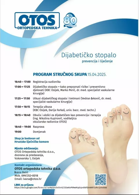 OTOS ortopedska tehnika organizira stručni skup Dijabetičko stopalo - prevencija i liječenje, koji će se održati 15. travnja, s početkom u 17 sati, u OTOS-ovoj dvorani za predavanja (Vukovarska 1). Marko Perić, vaskularni kirurg, govorit će o temi Dijabetičko stopalo - kako prepoznati rizike i preventivno djelovati, o temi Ulkusi dijabetičkog stopala i tretmani predavat će Vedran Ivković, vaskularni kirurg, o terapiji ulkusa govorit će Darija Farkaš, univ. bacc. med. techn., a o obući i ulošcima za dijabetičare kao prevenciji i terapiji ing. Nikolina Kupirović, voditeljica Obućarske radionice OTOS-a. Skup je bodovan od Hrvatske liječničke komore.