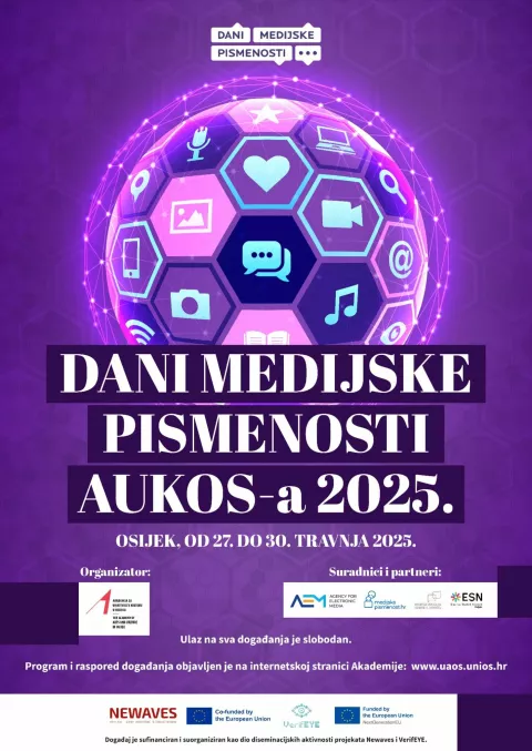 Kako bi se podignula svijest javnosti o važnosti medijske pismenosti i kritičkog razmišljanja o medijskim sadržajima te stvorili preduvjeti za medijsko obrazovanje što većeg broja građana, posebice djece i mladih, od nedjelje (27. travnja) do utorka (30. travnja) u Osijeku se održavaju Dani medijske pismenosti u organizaciji Akademije za umjetnost i kulturu u Osijeku (AUKOS) - Odsjeka za kulturu, medije i menadžment, u suradnji s partnerima.