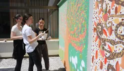 Pojasnio je da su ideje za oslikavanje inicijativa samih studentica, a on je više tehnička podrška. U atriju, odnosno unutarnjem prostoru vrtića oslikavali su dva stabla jabuke, a oba su podijeljena na dva dijela te predstavljaju sva četiri godišnja doba. Studentice su tu imale slobodu da izražavaju zajedno s djecom. Ispred samog vrtića na polukružnom zidu oslikali su divovsku jabuku koja pomalo ostavlja dojam trodimenzionalnosti. Ona će oplemeniti ulaz i postati simbolom vrtića, a vrtićarci će ju zasigurno zapamtiti kao uspomenu na vrtić. Djeca su im, naravno, pomagala te oslikala sve do 70 centimetara visine, a onda su oni nešto viši i stariji nastavili.