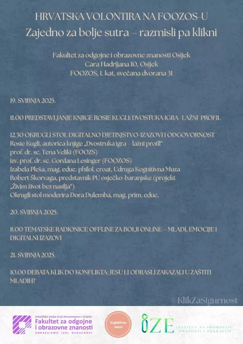 Fakultet za odgojne i obrazovne znanosti Sveučilišta Josipa Jurja Strossmayera u Osijeku, u suradnji s Institutom za promociju znanosti i edukacije, najavljuje trodnevni javni program u povodu nacionalne kampanje "Hrvatska volontira 2025.", koja i ove godine okuplja tisuće volontera diljem Hrvatske u promicanju društvene solidarnosti, aktivnoga građanstva i međugeneracijske podrške. Od 19. do 21. svibnja 2025., Fakultet će biti domaćin nizu edukativnih, interaktivnih i kulturnih događanja s fokusom na izazove odgoja i obrazovanja u digitalnom dobu – posebice mentalno zdravlje djece i mladih, digitalnu sigurnost te važnost zajednice u njihovoj zaštiti.