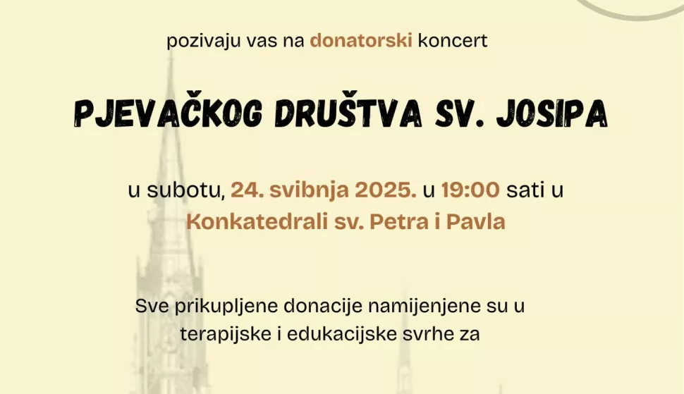 Inner Wheel klub Osijek, koji pripada velikoj svjetskoj ženskoj organizaciji International Inner Wheel u njegovanju prijateljstva, služenju zajednici i razumijevanju, poziva na još jedan donatorski koncert u njihovoj organizaciji. Pjevačko društvo sv. Josipa će u subotu u 19 sati u konkatedrali sv. Petra i Pavla održati koncert sakralne glazbe. Iz Inner Wheel kluba Osijek poručuju kako će sve prikupljene donacije biti namijenjene terapijskim i edukacijskim svrhama za Udrugu malih dijabetičara MaDi Osijek.