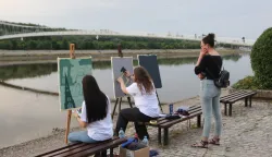 Okrenute prema Dravi, na klupi ispred štafelaja, studentice Akademije za umjetnost i kulturu Ivona i Tihana nanose uljane boje na platno. Motivi su dravski - most, luka obala... Obje su djevojke bile u majicama NK Osijeka i jedino što smo uspjeli doznati, jer su bile vrlo tajnovite, je da se radi o projektu koji Akademija radi u suradnji s osječkim prvoligašem.