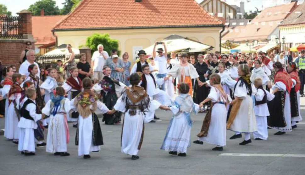 ĐAKOVO - Zastave Đakovačkih vezova, Grada Đakova, Osječko-baranjske županije, RH i EU, čvrsto držane u dječjim rukama, najavile su u vruće nedjeljno poslijepodne u središtu Đakova početak Malih vezova, njihove raspjevane povorke, što je, uz sudjelovanje 23 dječje grupe, prošla od Male crkve, preko korza, pokraj katedrale, Trgom do Strossmayerova parka, na čijoj je ljetnoj pozornici potom održan dječji folklorni program.