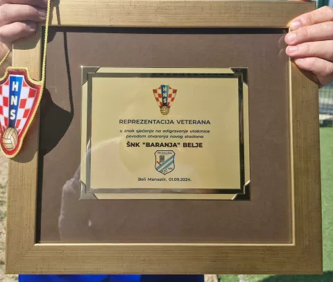 Pvi put u Belom Manastiru gostovala je reprezentacija veterana HNS-a, odigravši pritom utakmicu s veteranima ŠNK-a Baranja-Belje. Uoči utakmice predstavnici HNS-a uručili su kapetanu domaćih, Siniši Jukopili, prigodnu plaketu u povodu otvaranja novog stadiona.