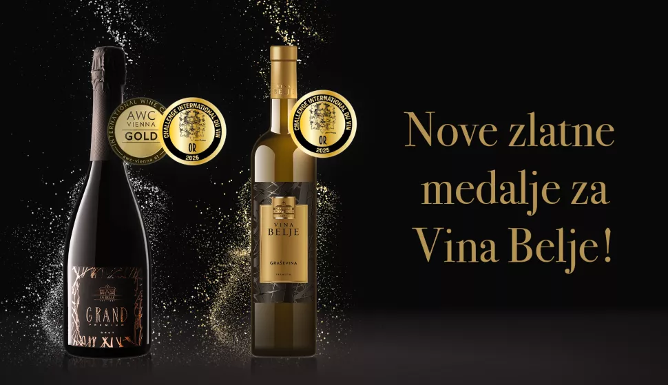Kolekcija ovogodišnjih nagrada Vina Belje bogatija je za dvije nove zlatne medalje - za pjenušac La Belle Grand s ocjenjivanja AWC Vienna i Challenge International du Vin te za zlatnu medalju za premium graševinu berbe 2024. s ocjenjivanja Challenge International du Vin, priopćuju iz Vina Belje.