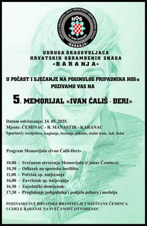 - UDHOS Baranja i ove godine organizira Memorijal "Ivan Ćališ - Đeri", u spomen na pripadnika HOS-a poginulog 17. veljače 1992. na sjevernoj liniji obrane Osijeka, ali i na sve poginule hrvatske branitelje. Jubilarni, 5. Memorijal prvi će se put održati u Đerijevu rodnom mjestu, Čemincu. Kako ističu organizatori, na Memorijalu će sudjelovati oko 250 sudionika iz 27 udruga, među kojima i udruge iz Bosne i Hercegovine, pa će to biti prvi međunarodni Memorijal.