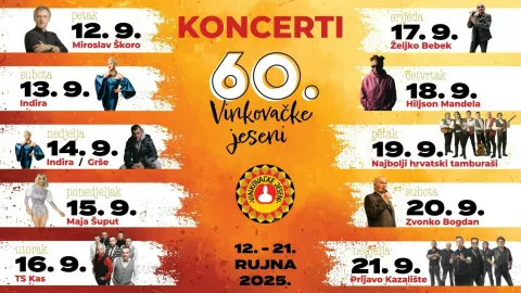 U Vinkovce na jubilarne Jeseni stižu Miroslav Škoro, Prljavo kazalište, Maja Šuput, Grašo, KAS,Najbolji hrvatski tamburaši, Zvonko Bogdan, Indira samo su neki koji će tijekom 10 dana zabavljati sve posjetitelje i goste grada na Bosutu.