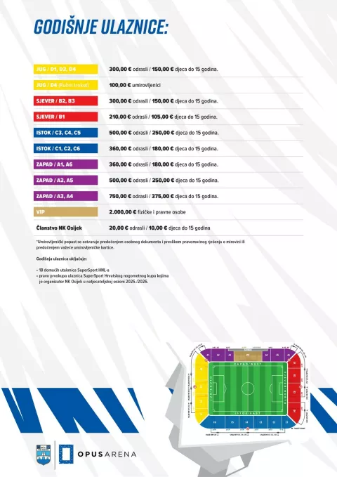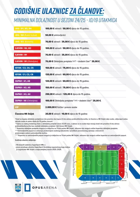 Naime, prije nego što je cjenik godišnjih ulaznica za novu sezonu objavljen, uskomešale su se navijačke strasti jer je iz kluba procurila informacija kako će doći do 50-postotnog poskupljenja godišnjih ulaznica. To se na kraju doista i dogodilo, ali ne za sve kategorije ulaznica. Poskupljenje se odnosi na pojedinačne ulaznice, a kada su u pitanju godišnje pretplate, ono zahvaća samo one koji su imali sezonsku ulaznicu, a nisu bili na deset od 19 domaćih utakmica u prošloj sezoni (18 prvenstvenih i susret 2. pretkola konferencijske lige protiv Levadije, nap. a.). Pojednostavljeno, svi nositelji godišnjih ulaznica koji su prošle sezone bili na deset od 19 domaćih susreta moći će ih obnoviti za nadolazeću sezonu po istoj cijeni. Intencija kluba posve je jasna. Ne žele samo prodati godišnju ulaznicu nego žele i motivirati ljude za dolazak na utakmicu. Naime, prošle sezone, u kojoj je prodano nešto više od 6000 godišnjih pretplata, bilo je slučajeva kada se na tribinama Opus Arene skupilo jedva nešto više od 2000 gledatelja. Naravno, mnogi će tako loš posjet tumačiti lošim igrama i rezultatima, ali na problem se može gledati i iz drugog kuta - da se posjedovanje godišnje ulaznice za utakmice NK Osijek ne cijeni dovoljno. Za početak, potrebno je naglasiti važnost članstva, koje snižava cijenu svih ulaznica za 50 posto. Visina godišnjih članarina nije se mijenjala. Za odrasle osobe iznosi 20, a za djecu do 15 godina 10 eura. Besplatno je članstvo za bebe do navršene prve godine i ono se ostvaruje isključivo na blagajnama, ne i online.