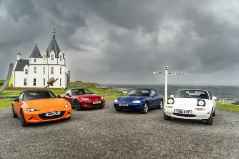 Predstavljena na sajmu automobila u Chicagu 1989. godine, Mazda MX-5 oduvijek je bila referentni čisti lagani sportski automobil koji je stavljao vozača u središte svoje privlačnosti. Do danas je u Mazdinoj tvornici Ujina u Hirošimi proizvedeno više od 1,2 milijuna modela MX-5. Četiri automobila koja su završila vožnju od 1000 milja bila su iz Mazdine UK Heritage flote – 1,6-litreni Mk1 iz godine 1990., kada je taj automobil lansiran u UK-u, Mk2, koji je lansiran prigodom desete obljetnice, Mk3, lansiran uz 25. obljetnicu i Mk4, koji je lansiran prigodom 30. obljetnice – svaki od njih čini ključni orijentir u povijesti modela MX-5.