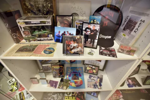 Tu je i štošta iz onog, kako kaže, ranog Zagreba, iz '86. i '87. godine pa sve do '92. Tu u su prvi grafiti zagrebački snimljeni prije nego su za Univerzijade prefarbani, tu su stare kazete, stare osobne iskaznice, prvi hip-hop press release što ga je 1989. sročila grupa The Silent Bomb za svoj demo. A evo i fotografije s jednog koncerta u SKUC-u i na njoj mladi Phillie kojem je ravno 14 godina! U toj vitrini njegova je posveta Zagrebu 1980-ih uz nekoliko vrijednih detalja iz Rijeke. Vitrina do posvećena je onom zbog kojeg se Zagrebu, a onda i Hrvatskoj, hip-hop i dogodio.