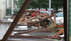 Najveća šteta nastala je rušenjem drvene oplate, skele, koja je već mjesecima uz zgradu Hrvatske pošte u Stepinčevoj ulici u Osijeku. Vrlo brzo nakon pojave vjetra začulo se glasno škripanje, a potom se cijela skela srušila na parkiralište. Dijelovi skele pritom su pali na parkirane automobile, pa je na njima nastala veća materijalna šteta. Kako je riječ o masivnoj drvenoj konstrukciji, vlasnici automobila koji su dotrčali do svojih vozila nisu ju mogli pomaknuti. U očaju, pozvali su one koji to mogu učiniti, a riječ je o profesionalnim vatrogascima Javne vatrogasne postrojbe Osijek.