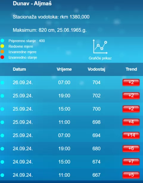 Prema podacima Hrvatskih voda, vodostaj kod Batine u četvrtak u devet sati iznosio je 689 centimetara, što je 19 centimetara manje od jučerašnjeg maksimuma od 708 centimetara, dok je vodostaj Drave kod Osijeka u isto vrijeme bio 396 centimetra, ili četiri centimetra manji od jučerašnjeg maksimuma.
