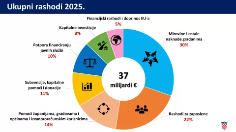 “Ukupni prihodi veći su u odnosu prema 2024. godini 8,6 posto, a velik učinak na prihode imaju povećani porezni prihodi, ali i znatno brže povlačenje sredstva iz EU-ovih fondova", rekao je premijer Andrej Plenković. Ukupni su rashodi u odnosu prema tekućem planu za 2024. godinu veći 10,2 posto, ili 3,4 milijarde eura. Proračun je usmjeren ponajprije na građane, a ima socijalnu, razvojnu i održivu komponentu, ocijenio je Plenković. Njime se, kako je rekao, želi osigurati bolji životni standard kroz rast mirovina i plaća, pomoć osjetljivim skupinama i provedbu mjera za reguliranje cijene struje, plina i goriva, a tu je i provedba Nacionalnog programa stambene politike.
