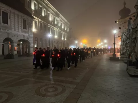 Kolona hodočasnika s upaljenim lampionima u rukama išla je najdužom vinkovačkom ulicom, na čije su obje strane uz cestu postavljeni zapaljeni lampioni, uz molitvu koju su predvodili župnik i kapelan Župe sv. Euzebija i Poliona, vlč. Florijan Kvetek i vlč. Antonio Pekić. "Osjećam se kako se osjeća onaj tko u euharistijskoj žrtvi uči zahvaljivati i tako svaku ljudsku žrtvu povezati s Kristovom žrtvom, koja i danas u sebe uključuje sve one koji su našu domovinu nosili u srcu, ne za sebe, nego za buduće naraštaje. Za one koji danas hodaju našim gradom, za one koji danas mole želeći da i njihova djeca budu spremna snagom Kristove žrtve nasljedovati žrtvu onih kojih se, na samo večeras, ali posebno večeras, sjećamo. I ova molitva je ništa drugo nego ponovni znak zahvalnosti, pa vjerujem da će iz ljudskih, a posebno iz kršćanskih srdaca, trajati dok god je naših generacija, našeg naroda i Kristove Crkve", kazivao je vlč. Florijan Kvetek dok se duga kolona lagano kretala Zvonimirovom ulicom.