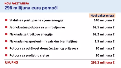 - Ovo je cjelovit i ciljan paket kojim pomažemo svima kojima je to u ovom trenutku potrebno i osiguravamo kontinuitet mjera građenja sigurnosne mreže očuvanja socijalne kohezije, predvidljivosti i pomoći kućnim proračunima i konkurentnosti hrvatskog gospodarstva - dodaje premijer.