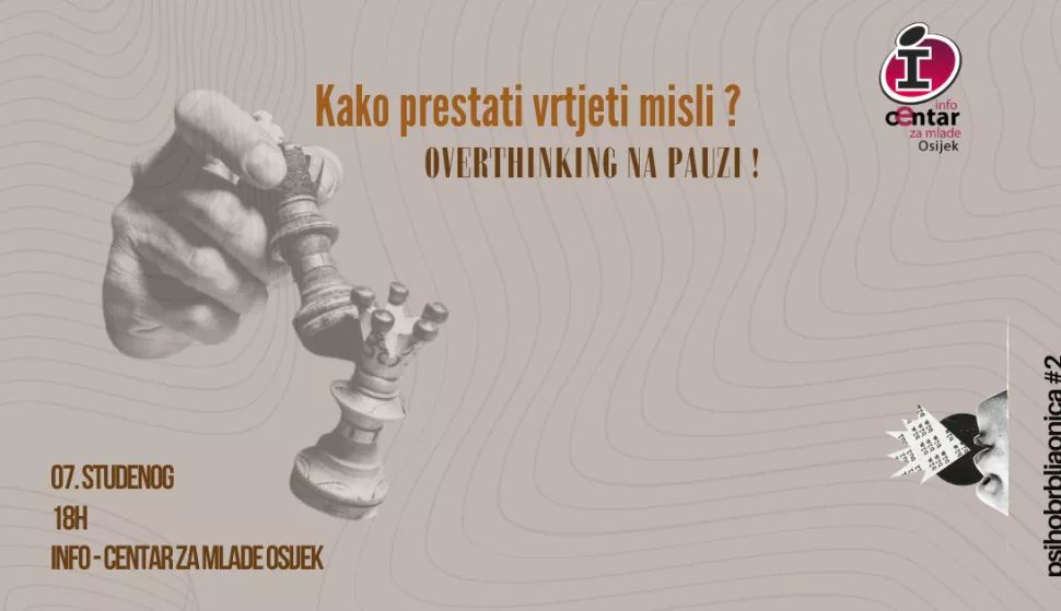 Iz Info-centra za mlade pozivaju na Psihobrbljaonicu posvećenu temi overthinkinga - Kako prestati vrtjeti misli? U opuštenom će okruženju sudionici dobiti korisne informacije i alate koji će im pomoći da bolje razumiju uzroke prekomjernog razmišljanja i nauče tehnike za njegovo uspješno smanjenje. U otvorenom će razgovoru i podršci sudionici istražiti kako prepoznati znakove overthinkinga i što pokreće ovaj začarani krug misli, učinkovite strategije za prekidanje misaonih obrazaca koji mogu dovesti do stresa i nesigurnosti, jednostavne, ali moćne tehnike za upravljanje mislima i usmjeravanje fokusa na bitno, te kako postići ravnotežu između analitičnosti i prisutnosti u sadašnjem trenutku.