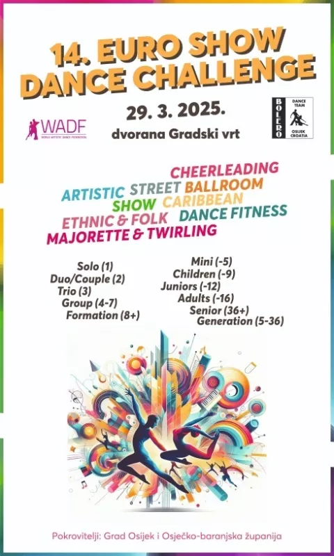U subotu će se u dvorani Gradski vrt održati Međunarodno plesno natjecanje 14. Euro Show Dance Challenge. Za samo natjecanje, koje organizira osječki Plesni klub Bolero, i koje traje od ranih jutarnji do kasnih večernjih sati, prijavljeno je oko tisuću plesača iz nekoliko europskih država. Plesači će se natjecati u četiri plesne kategorije: umjetnički plesovi, urbani plesovi, karipski, latino i standardni plesovi te plesne fitness kategorije. Starosni razredi su Mini Kids (5 – 8 godina), Children (9 - 11), Juniors (12 - 15), Adults (16 –), Senior (36 -), Mix Generation (5 - 36). Discipline su solo, duo, parovi, trio; grupe (4 - 7 plesača), formacije (8 + plesača) i produkcija (25 + plesača). Cijena ulaznice je 7 eura, a zahvaljujući Gradu i Županiji djeca do deset godina imaju besplatan ulaz.
