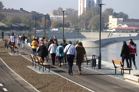 Veliki dan za Osječane bio je 26. listopada prošle godine. Otvorena je šetnica uz Dravu, koja povezuje dvije gradske četvrti, Donji i Gornji grad. Odmah prvoga dana priliku da prošeću novom promenadom dobili su brojni Osječani, naravno i njihovi gosti. Prigodnom šetnjom od platoa ispred stare Kožare do novog lukobrana u blizini Kliničkog bolničkog centra Osijek, a onda i puštanjem dimnih bombi u osječkoj, bijelo-plavoj boji u Osijeku je i službeno otvorena nova promenada i obaloutvrda kojom su Gornji i Donji grad sada spojeni i uz svoju rijeku Dravu. Od istoka do središta grada, u ukupnoj dužini od 12 kilometara.