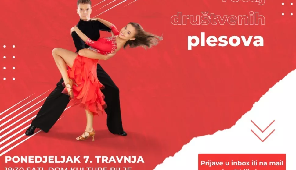 U tijeku je tečaj društvenih plesova u Bilju koji organiziraju Kulturno-razvojni centar Općine Bilje i Sportsko-plesna udruga Feniks. Ravnateljica KRC-a Ivana Plaščak kaže kako je tečaj za polaznike iz njihovog mjesta besplatan. Kako doznajemo od plesnog trenera Milana Bugarića, s budućim će plesačima koordinirati prve korake na podiju izvrsni treneri koji su iskustvo stjecali na brojnim natjecanjima osvajajući nagrade i priznanja. Plesat će se engleski i bečki valcer, tango, foxtrot, disco fox i drugi plesovi, a prijaviti se mogu svi stariji od deset godina. Tečaj traje dva mjeseca, a održavat će se dva puta tjedno u Domu kulture Bilje. Prijave na e-mail: [email protected]. Bugarić podsjeća kako je 29. travnja Svjetski dan plesa i ovo je prilika svima koji se odluče naučiti plesati.