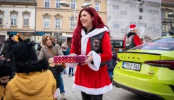 Na Trg Ante Starčevića stigli su gotovo u sekundu točno u podne, prema planiranom rasporedu, te su se ondje najduže zadržali u druženju, fotografiranju i darivanju djece.