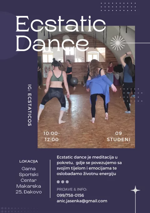 ĐAKOVU - U Đakovu će u subotu, 9. studenoga, u sportskom centru Gama, u Makarskoj ulici 25, biti održana prva radionica svjesnog ecstatic plesa, od 10 do 12 sati. Ecstatic dance je meditacija u pokretu, gdje se povezujemo sa svojim tijelom i emocijama te oslobađamo životnu energiju, stoji u pozivu. Prijave na telefon 099 758 0156 ili [email protected].