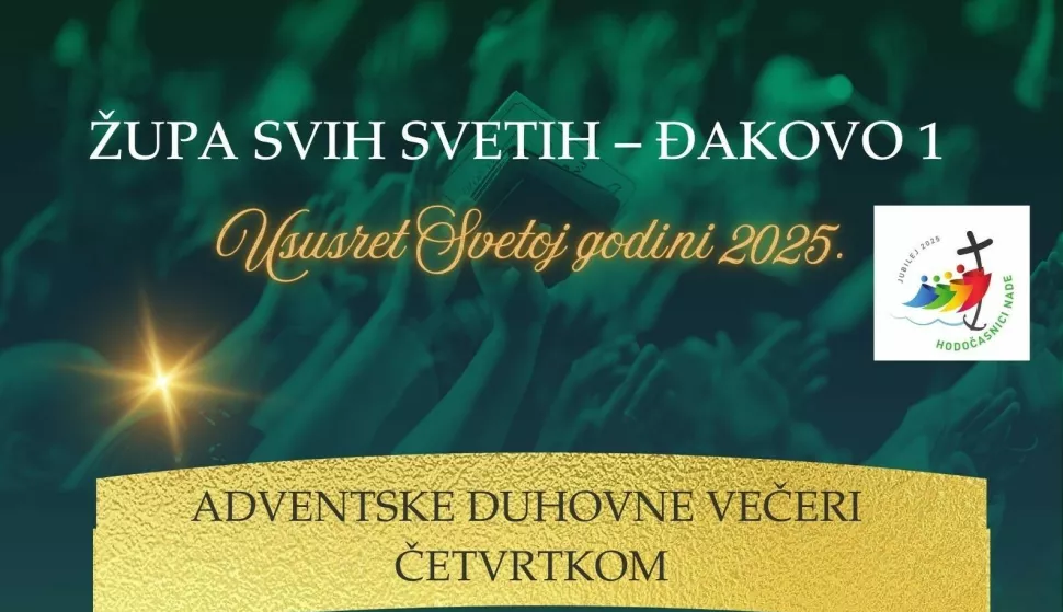 ĐAKOVO - Treća Adventska duhovna večer četvrtkom, a ususret Svetoj godini 2025., u organizaciji Župe Svih Svetih u Đakovu, održat će se u četvrtak, 19. prosinca. Započinje misnim slavljem s kratkom homilijom u đakovačkoj katedrali u 18.30, a nastavlja se tematskim predavanjem o otajstvu Utjelovljenja u župnoj dvorani. Voditelj je vlč. dr. Ivan Benaković, profesor na KBF-u u Đakovu, izvijestio je Tiskovni ured u Đakovu.