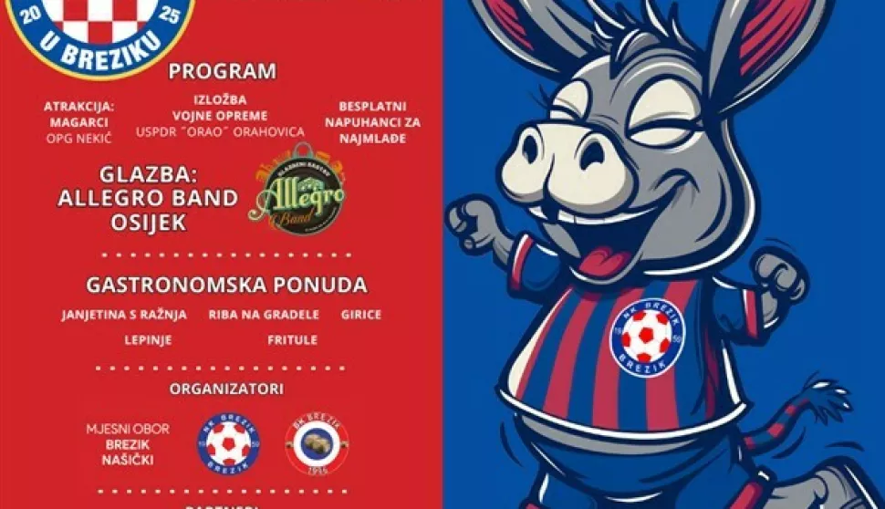 BREZIK NAŠIČKI - U Breziku Našičkom u subotu, 19. srpnja, na igralištu NK Brezik bit će održana Dalmatinska večer. Manifestacija počinje u 18 sati, a goste očekuje bogat program - od glazbe i gastronomije do zabave na otvorenom. Za dobar ritam pobrinut će se Allegro band iz Osijeka, a u gastroponudi bit će janjetina s ražnja, riba na gradele, girice, fritule i lepinje. Organizatori pripremaju i posebnu atrakciju - magarce s OPG-a Nekić. Izložbom vojne opreme u program manifestacije uključit će se i Udruga specijalne policije iz Domovinskog rata “Orao” Orahovica dok će za najmlađe biti postavljeni besplatni napuhanci. Dalmatinska večer održava se u organizaciji Mjesnog odbora Brezik Našički, NK Brezik i Boćarskog kluba Brezik, a cilj je spojiti šarm i toplinu juga s gostoljubivošću slavonskog kraja.