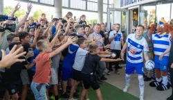 Uvertiru večerašnje ovosezonske premijere protiv Dinama NK Osijek odradio je druženjem s navijačima na platou ispred klupskog Fan shopa. U njemu je sudjelovala cijela momčad Bijelo-plavih zajedno sa stručnim stožerom, na čijem je čelu Simon Rožman. Okupilo se 500-tinjak navijača koji su nestrpljivo iščekivali dolazak momčadi, ali i službenu promociju novih garnitura dresova. Zanimljivo je bilo što su stožer i igrači na poprište događaja došli klupskim autobusom, iako su se okupili tek nekoliko stotina metara dalje od Fan shopa. Kao i uvijek prilikom takvih okupljanja glavne uloge pripale su najmlađim Osijekovim navijačima koji su "pucali" selfije s igračima i trenerima te skupljali autograme. Ipak, najveću pozornost izazvala je promocija novih dresova, koji su prema mišljenju većine pun pogodak. Prvi dres je standardan, bijela osnovna površina s poprečnim debljim i tanjim plavim crtama u različitim dezenima, a kroz cijeli dres je utisnuto NKOS. Drugi je dres vrlo lijep. Opet je tamnoplave boje s tankim svjetloplavim i bijelim crtama. U pozadinu tog dresa utisnuta je Opus Arena. Treći je dres u startu izazvao najviše kontroverze jer slika objavljena na klupskoj Facebook stranici ostavila je pogrešan vizualni dojam kada je boja u pitanju. Dres nije zelene nego sivomaslinaste boje s narančastim detaljima, a njegovu pozadinu krase simboli grada Osijeka poput Bastiona, zdenca, pješačkog mosta, konkatedrale. Pravi doživljaj tog trećeg dresa dobije se tek pod dnevnim suncem.