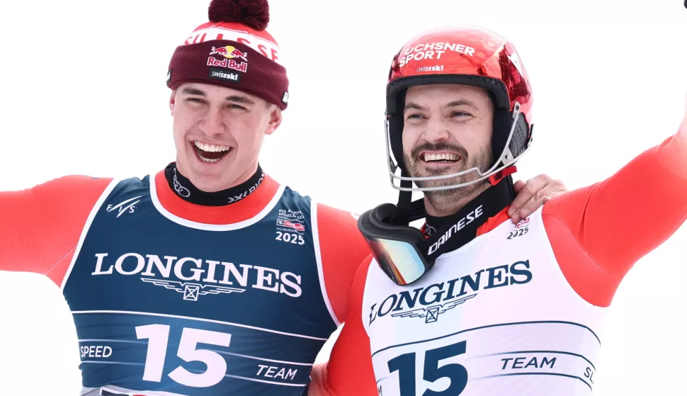 Švicarci Franjo Von Allmen i Loic Meillard postali su svjetski prvaci u ekipnoj kombinaciji, ispred svojih sunarodnjaka Alexisa Monneya i Tanguya Nefa koji su osvojili srebro te Stefana Rogentina i Marca Rochata kojima je pripala bronca na Svjetskom prvenstvu u Saalbachu. Von Allmen i Meillard pobijedili su s vremenom 2:42.38, njihovi sunarodnjaci Alexis Monney i Tanguey Nef bili su drugi s 27 stotinki sporijim vremenom (2:42.65), a treći su bili Stefan Rogentin i Marc Rochat sa 43 stotinke zaostatka. Von Allmen olakšao je posao Meillardu jer je u spustu bio drugi, iza Monneya, a Stefan Rogentin nakon spusta bio je osmi. Za Franju je ovo druga zlatna medalja na ovom Svjetskom prvenstvu nakon što je u nedjelju osvojio zlato u spustu.
